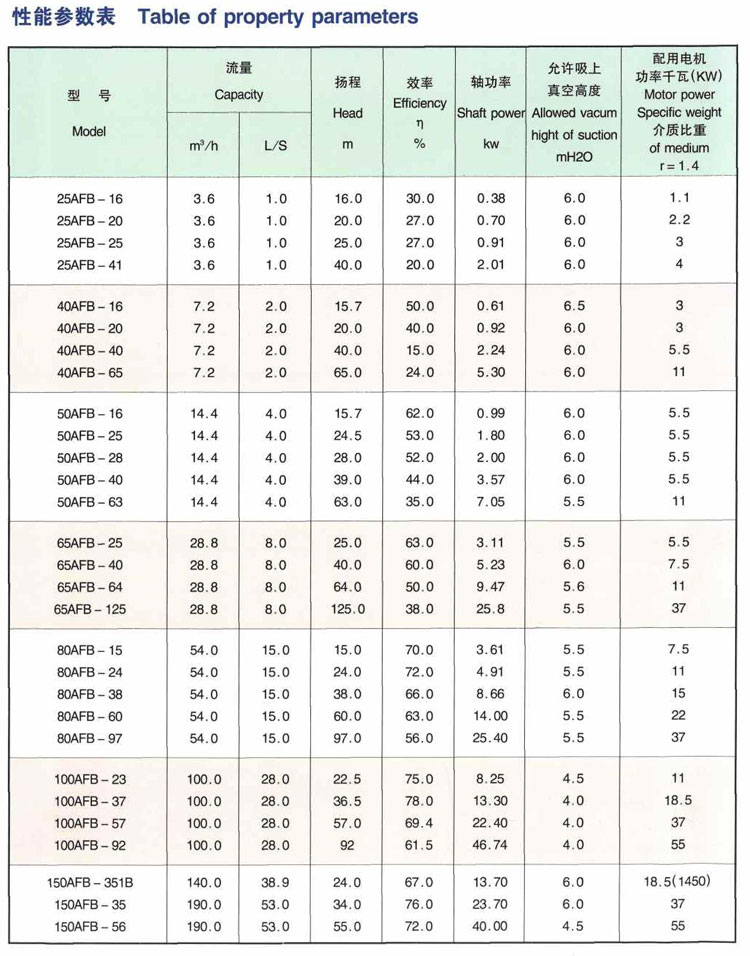 AFB、FB型泵是單級(jí)、單吸懸臂式耐腐蝕離心泵,該泵過(guò)流部位零件根據(jù)輸送介質(zhì)不同,全部選用各種耐腐耐磨合金鋼材料制造,泵的進(jìn)口壓力一般不大于O.ZMPa,必要時(shí)可達(dá)到0.35一0.4mpa,介質(zhì)溫度一20℃一+130℃,廣泛應(yīng)用于石油、化工、冶金、合成纖維、醫(yī)藥、食品等工業(yè)部門。